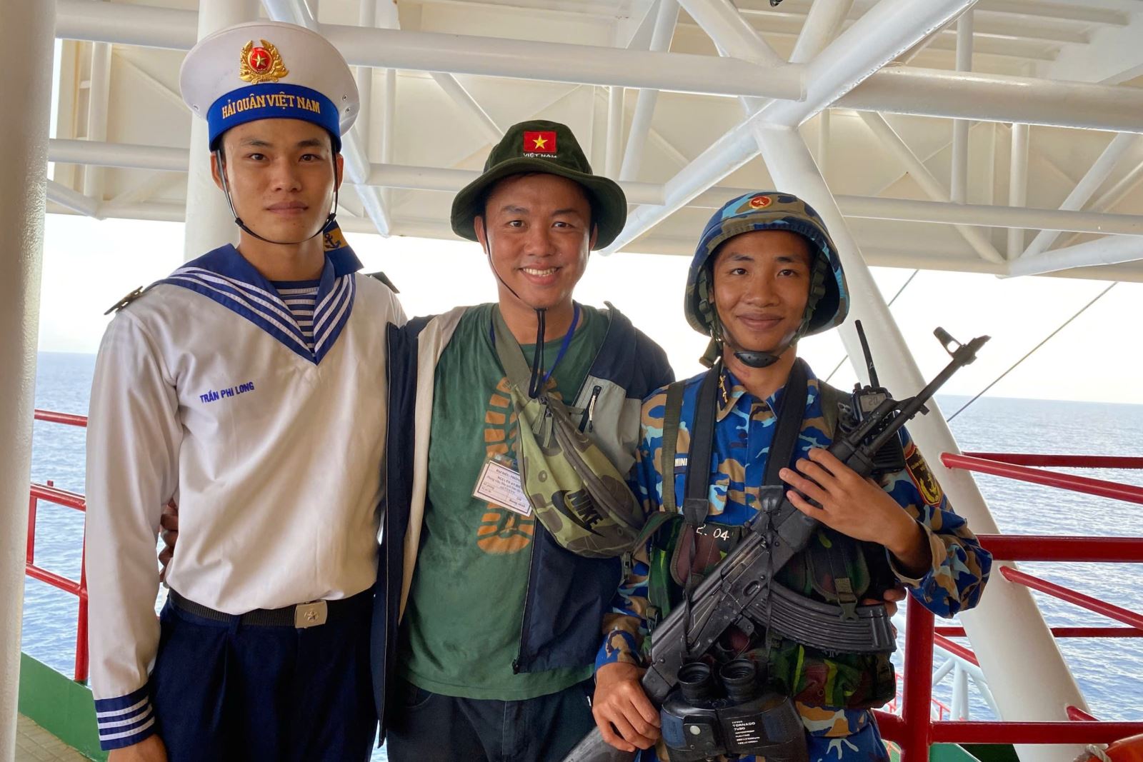 Phóng viên An Hiếu (ở giữa) cùng các chiến sĩ Hải quân làm nhiệm vụ tại Nhà giàn DK1, trong một chuyến công tác.