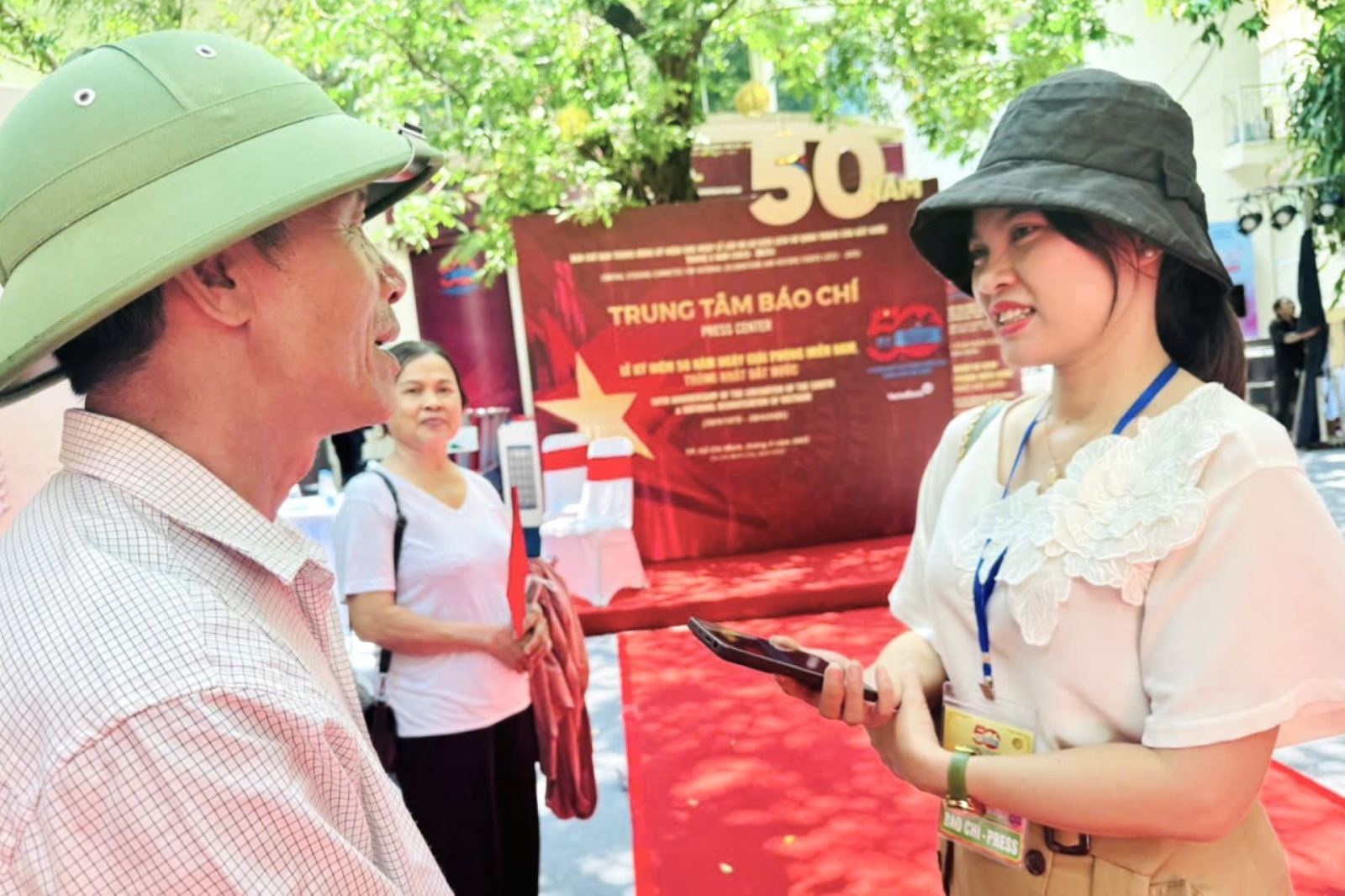 Chị Vương Lê tác nghiệp tại Lễ kỷ niệm 50 năm Ngày Giải phóng miền Nam, thống nhất đất nước.