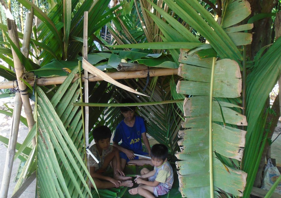 Chỉ bằng vài tàu lá chuối cùng vài cọng tàu dừa buộc chặt lại bằng sợi dây chuối tước sợi mảnh là lũ trẻ bọn tôi đã hoàn thành xong cho mình ngôi nhà chòi be bé, xinh xinh. Thích nhất là được xây nhà chòi ngay trong vườn trái cây nhà nội. Còn gì thú vị bằng những trưa hè nằm trong nhà chòi lót lá chuối mát rượi vừa tha hồ nhóp nhép chùm ổi sẻ mới hái, len lén nhón vài trái mãng cầu sống đem ủ vào đống lá chuối khô, cảm giác bẻ cho nhanh vì sợ người lớn phát hiện làm lũ trẻ bọn tôi phấn khích cứ cười vang khoái chí. Thế là cứ mỗi ngày lại chui vô nhà chòi giở đám lá lên thăm mãng cầu đã chín chưa làm bọn tôi vô cùng hồi hộp như là cất giấu “bí mật vĩ đại”.