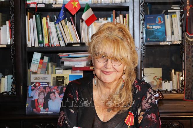 Bà Sandra Scagliotti, nhà Việt Nam học, Lãnh sự Danh dự Việt Nam tại Turin và Genoa trả lời phỏng vấn của phóng viên TTXVN. Ảnh: Thanh Hải/PV TTXVN tại Italy