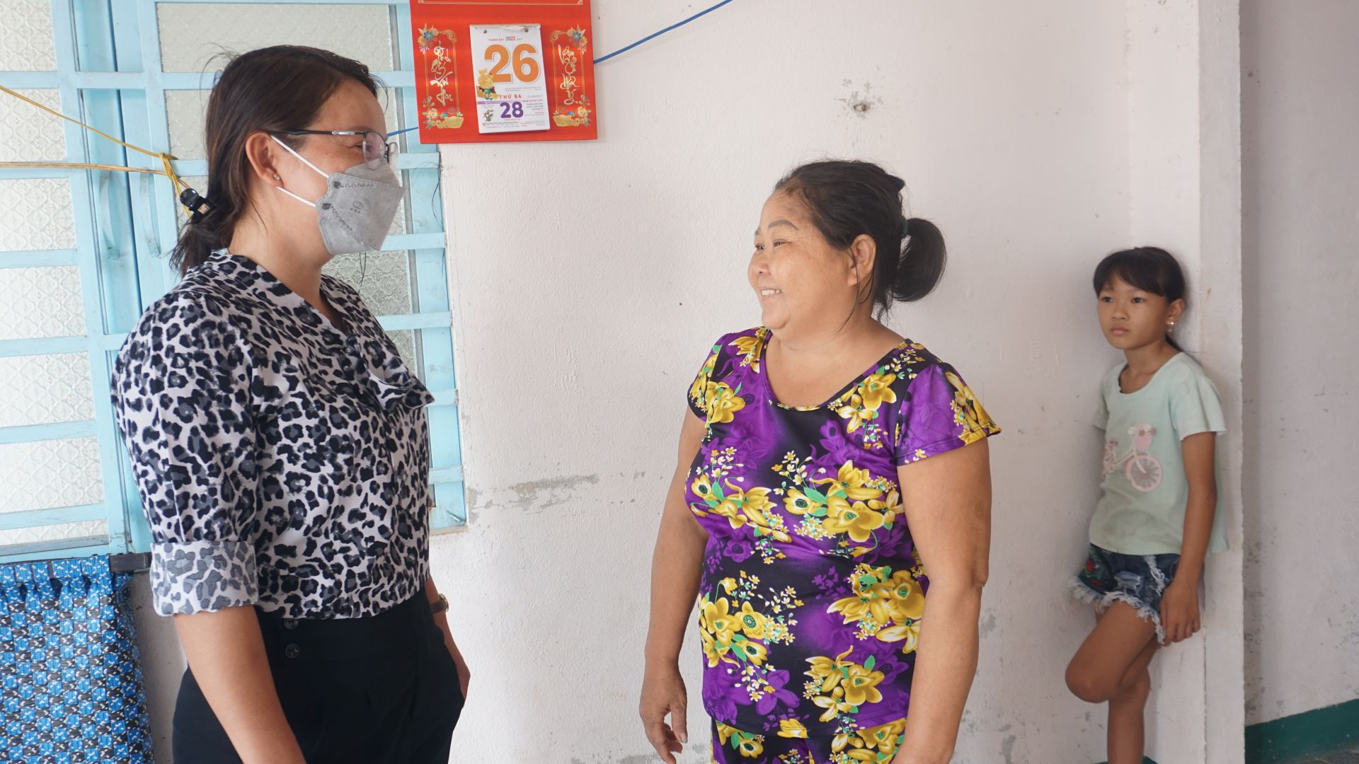 Bà Quách Thị Tình- Phó Chủ tịch UBND xã Tân Hội (bên trái) thăm người dân trong khu tái định cư Hội An.
