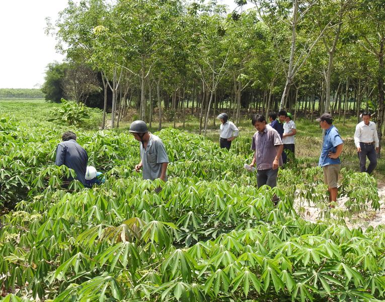 Ðại diện công ty sản xuất cùng người dân và chính quyền địa phương đang khảo sát tại ruộng mì nhà ông Cường.