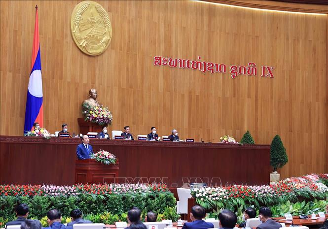Chủ tịch nước Nguyễn Xuân Phúc phát biểu tại Kỳ họp lần thứ nhất, Quốc hội Lào khóa IX ngày 10/8/2021. Ảnh: Thống Nhất/TTXVN