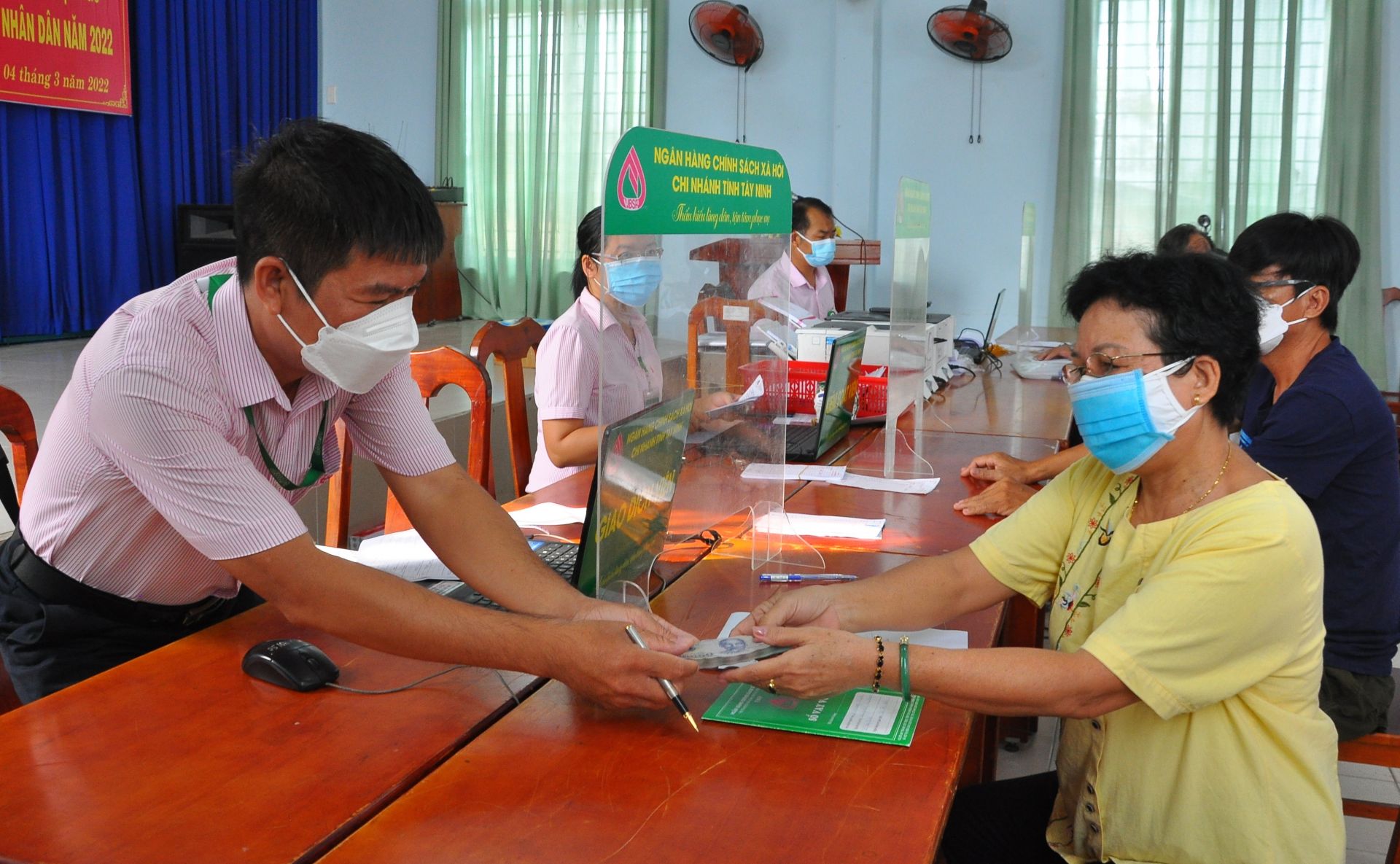 Cán bộ Ngân hàng Chính sách xã hội tỉnh trao tiền cho người dân phường 2, thành phố Tây Ninh vay (ảnh: Minh Dương)