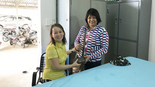 Chị Nguyễn Thị Thảo (áo vàng) vui mừng nhận lại chiếc ví từ chị Thời.