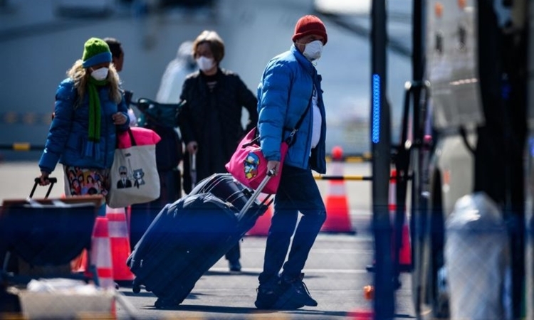 Hành khách rời khỏi tàu Diamond Princess ngày 21/2. Ảnh: AFP.