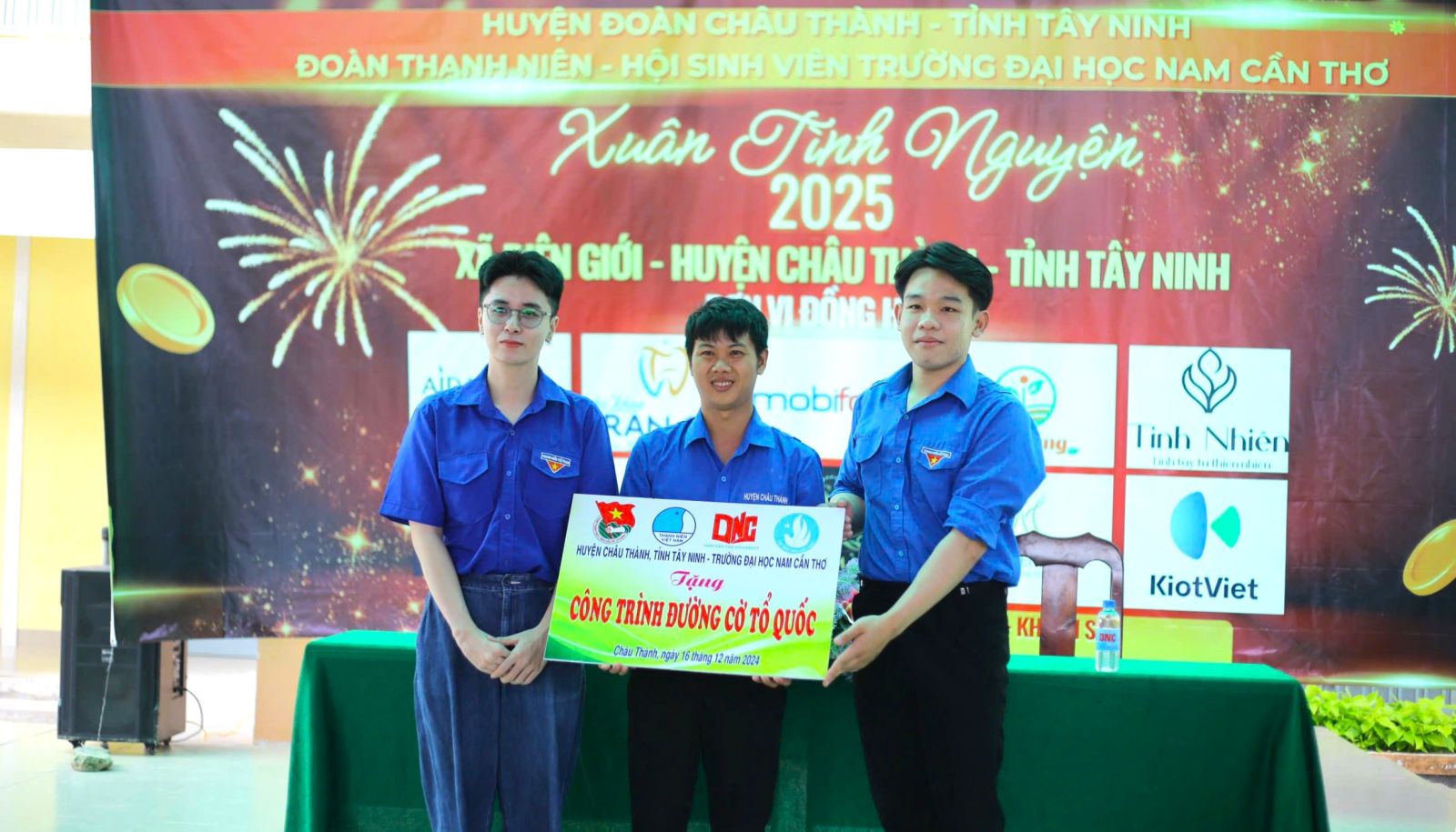 Sinh viên Đại học Nam Cần Thơ trao bảng tượng trưng tặng công trình Thắp sáng đường quê cho Đoàn Thanh niên xã Biên Giới.