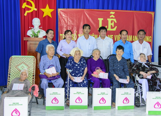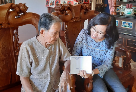 Đoàn ân cần thăm hỏi sức khỏe, cuộc sống hiện tại của mẹ và gia đình; đồng thời trao tặng Mẹ VNAH Phạm Thị Bé 1 phần quà và sổ tiết kiệm 5 triệu đồng.