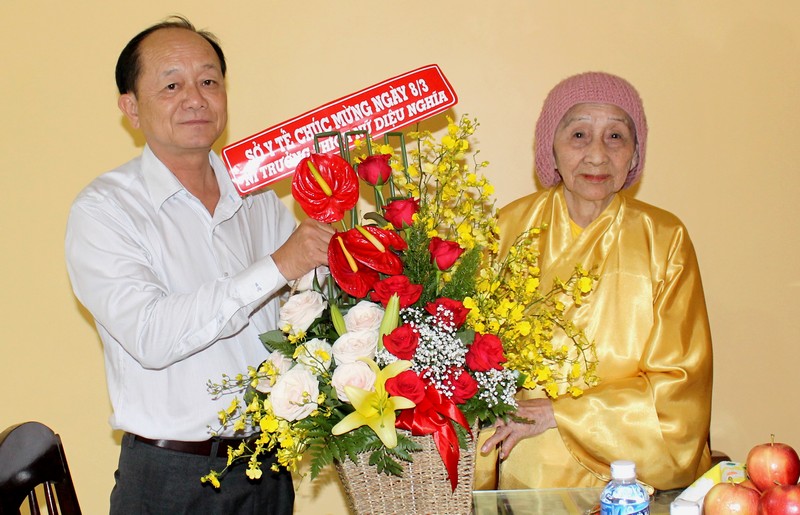 | Bác sĩ Nguyễn Văn Cường- Phó Giám đốc Sở Y tế trao lẵng hoa chúc mừng Ni trưởng nhân ngày Quốc tế phụ nữ 8.3 |