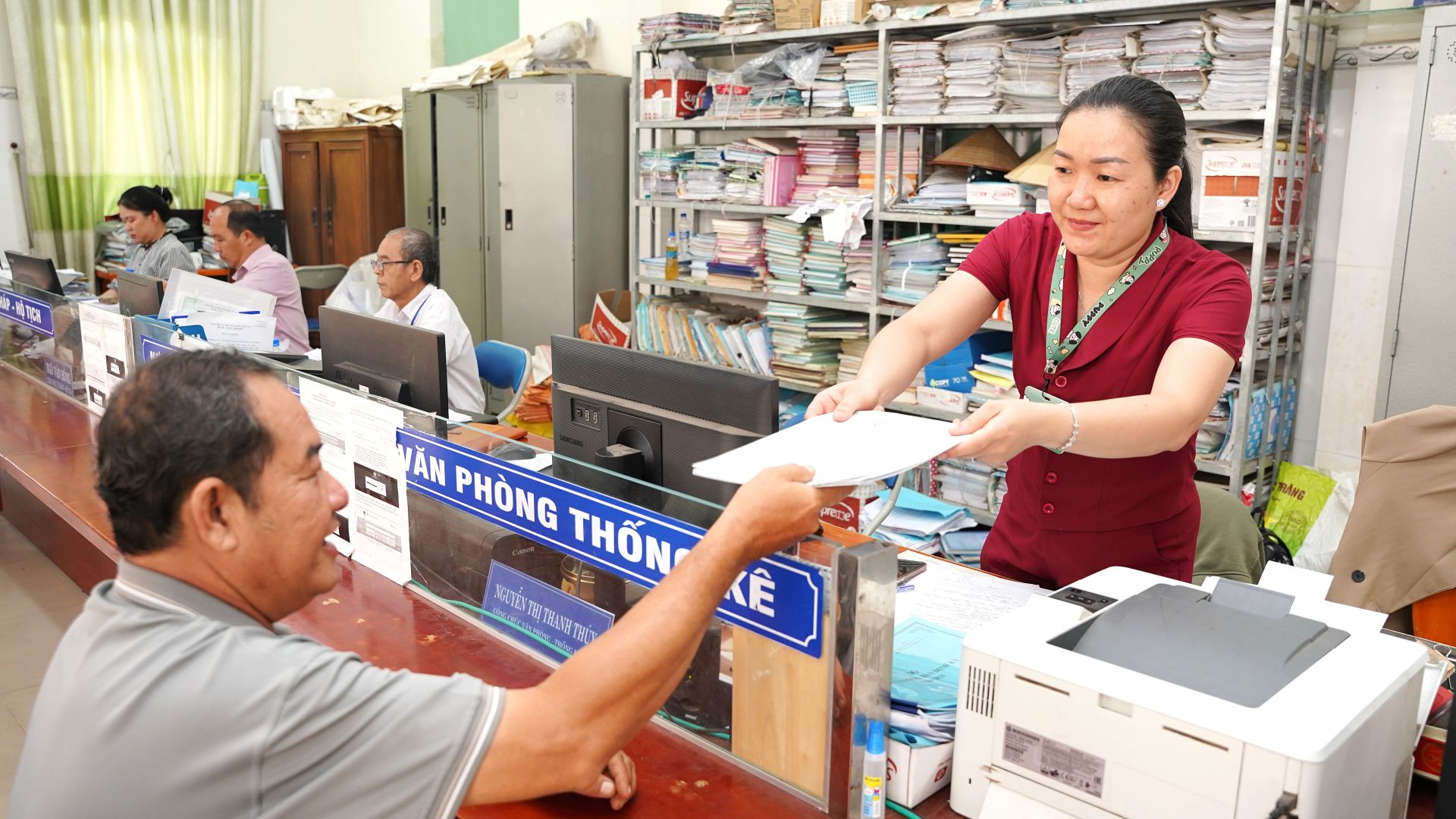 Công chức bộ phận Một cửa xã Tân Lập trả kết quả giải quyết thủ tục hành chính cho người dân