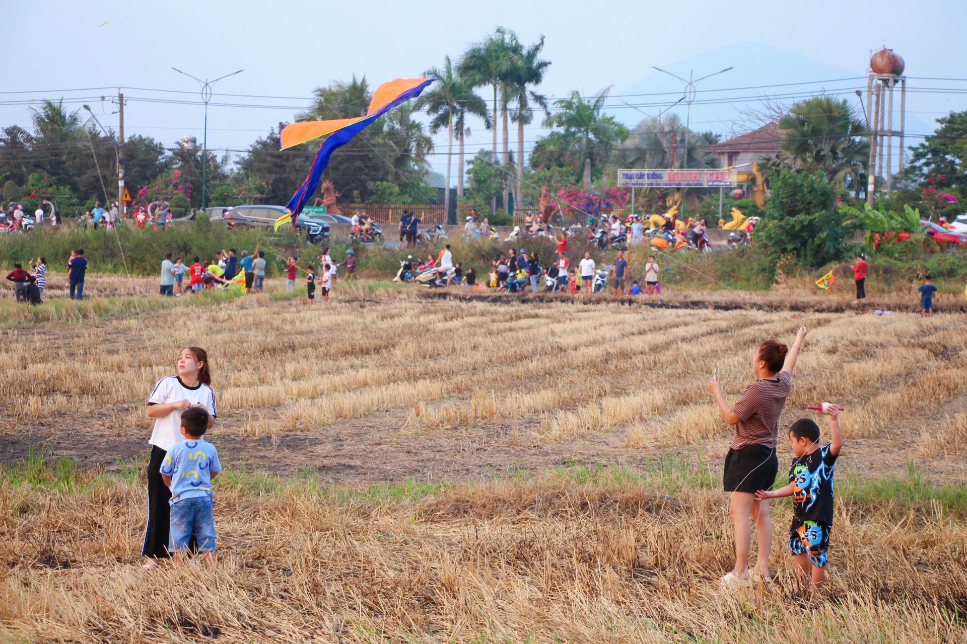 Cánh đồng lúa cạnh chùa Gò Kén trở thành điểm thả diều mỗi buổi chiều.