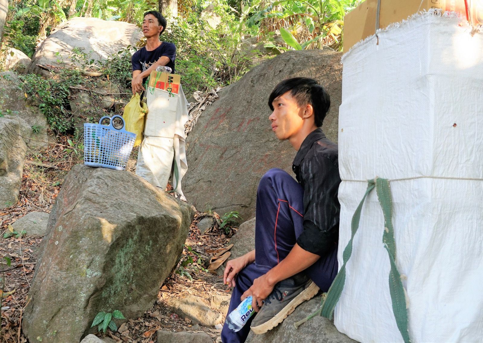Phút nghỉ ngơi trên đường khuân vác hàng hoá lên đỉnh núi của hai anh em Nhựt.