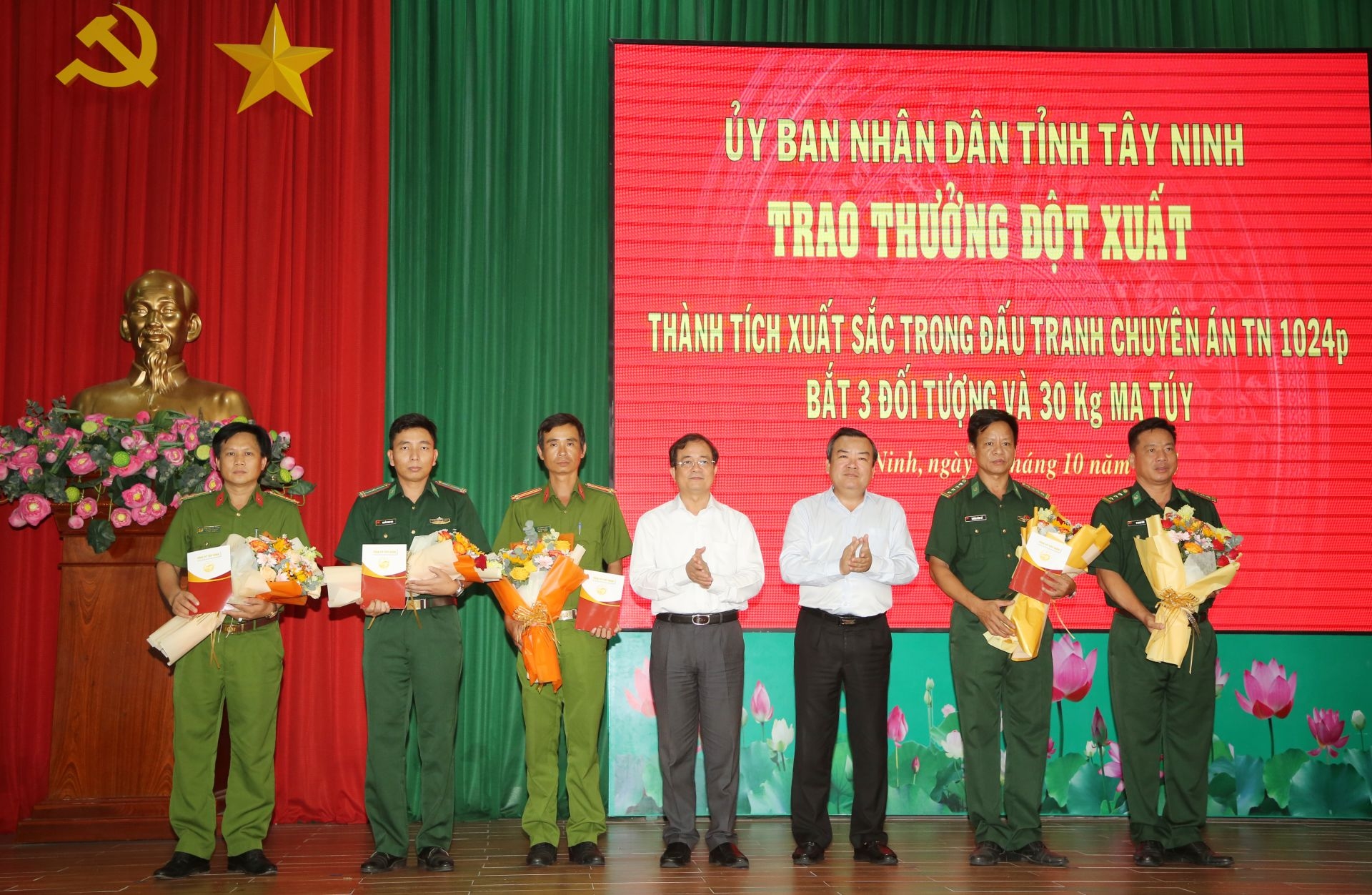 Phó Bí thư Thường trực Tỉnh uỷ Phạm Hùng Thái và Phó Chủ tịch Thường trực UBND tỉnh Nguyễn Hồng Thanh khen thưởng cho các tập thể tham gia phá chuyên án TN1024p. Ảnh: Tố Tuấn
