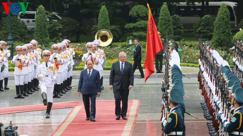 6. Từ 22-24/8/2019, Thủ tướng Australia Scott Morrison và Phu nhân đã thăm chính thức Việt Nam theo lời mời của Thủ tướng Chính phủ Nguyễn Xuân Phúc. Chuyến thăm diễn ra sau hơn một năm kể từ khi hai nước thiết lập quan hệ Đối tác chiến lược hồi tháng 3/2018. Ảnh: Thủ tướng Nguyễn Xuân Phúc và Thủ tướng Australia duyệt đội danh dự.