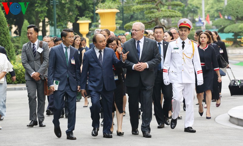Chuyến thăm Việt Nam của Thủ tướng Scott Morrison được kỳ vọng sẽ tạo ra động lực và nền tảng mới cho quan hệ giữa hai nước thúc đẩy giải quyết những vấn đề an ninh chiến lược khu vực và thế giới cùng quan tâm; trong đó có an ninh năng lượng, nguồn nước, biến đổi khí hậu, an ninh an toàn và tự do hàng hải ở Biển Đông. Ảnh: Thủ tướng Nguyễn Xuân Phúc trao đổi với Thủ tướng Australia trên đường sang Văn phòng Chính phủ để tiến hành hội đàm.
