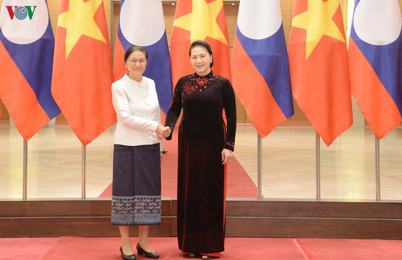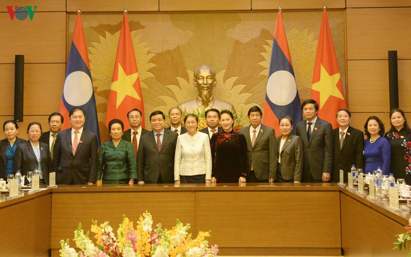 Chuyến thăm thể hiện tình cảm thân thiết của cá nhân Chủ tịch Quốc hội Lào đồng thời là minh chứng về sự tin cậy của Quốc hội Lào dành cho Quốc hội Việt Nam. Quốc hội Việt Nam nhận thức sâu sắc rằng việc không ngừng củng cố và phát triển quan hệ Việt Nam - Lào là một trong những nhiệm vụ chiến lược, có ý nghĩa sống còn đối với an ninh và phát triển của mỗi nước. Ảnh: Lãnh đạo Quốc hội Việt-Lào chụp ảnh chung sau khi hội đàm