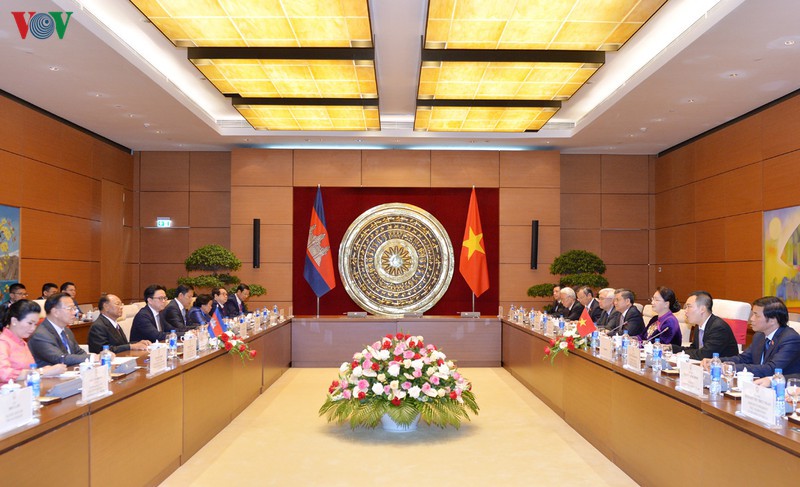 13. Từ ngày 28-30/5, đoàn đại biểu cấp cao Vương quốc Capuchia do Chủ tịch Quốc hội Samdech Heng Samrin dẫn đầu thăm chính thức Việt Nam theo lời mời của Chủ tịch Quốc hội Nguyễn Thị Kim Ngân. Ảnh: Chủ tịch Quốc hội Nguyễn Thị Kim Ngân hội đàm với Chủ tịch Quốc hội Samdech Heng Samrin.