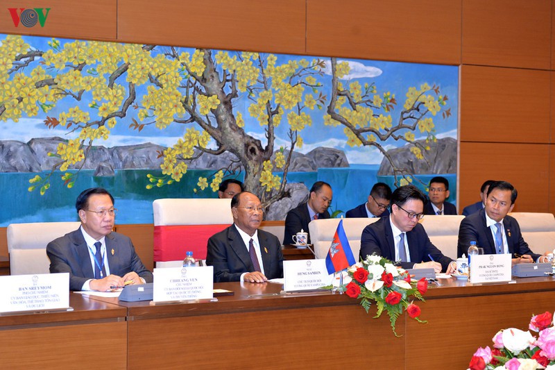 Hai nhà lãnh đạo bày tỏ vui mừng về quan hệ hợp tác tốt đẹp giữa Quốc hội Việt Nam với Quốc hội Campuchia. Hai bên đã thực hiện tốt các nội dung trong Thỏa thuận hợp tác giữa hai Quốc hội tháng 7/2012, thường xuyên trao đổi đoàn cấp cao Quốc hội và các cơ quan chuyên môn, nhóm nghị sỹ hữu nghị Quốc hội hai nước. Ảnh: Chủ tịch Quốc hội Samdech Heng Samrin tại cuộc hội đàm.