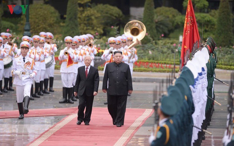 Ngay sau Thượng đỉnh Mỹ-Triều, trong 2 ngày 1-2/3/2019, Chủ tịch Triều Tiên Kim Jong-un thăm chính thức Việt Nam theo lời mời của Tổng Bí thư, Chủ tịch nước Nguyễn Phú Trọng. Đây được coi là chuyến thăm lịch sử đánh dấu lần đầu tiên sau gần 55 năm một nhà lãnh đạo Triều Tiên thăm chính thức Việt Nam. Ảnh: Tổng Bí thư, Chủ tịch nước Nguyễn Phú Trọng cùng Chủ tịch Triều Tiên duyệt đội danh dự.
