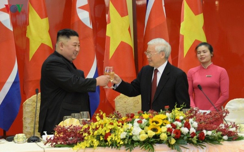Chuyến thăm Việt Nam lần này của Chủ tịch Kim Jong-un là dấu mốc mới, rất quan trọng trong lịch sử quan hệ giữa hai Đảng, hai nước, đồng thời là dịp tốt để lãnh đạo hai nước thông báo cho nhau về tình hình mỗi nước, trao đổi sâu về việc củng cố, phát triển quan hệ song phương cũng như về những vấn đề quốc tế, khu vực cùng quan tâm. Ảnh: Tổng Bí thư, Chủ tịch nước Nguyễn Phú Trọng và Chủ tịch Triều Tiên nâng cốc chúc mừng quan hệ Việt-Triều.
