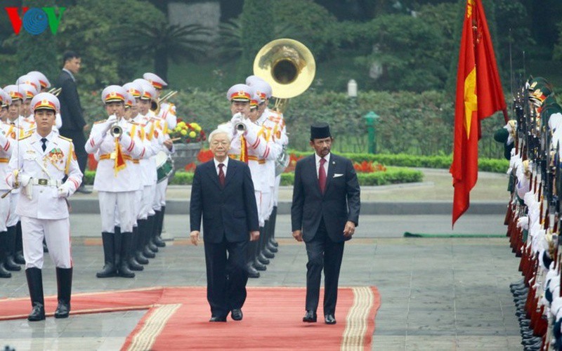 3. Từ ngày 26-28/3/2019, Quốc vương Brunei Haji Hassanal Bolkiah thăm chính thức Việt Nam theo lời mời của Tổng Bí thư, Chủ tịch nước Nguyễn Phú Trọng. Chuyến thăm nhằm thắt chặt quan hệ hữu nghị, hướng tới kỷ niệm 30 năm thiết lập quan hệ ngoại giao giữa hai nước (1992 - 2022). Ảnh: Tổng Bí thư, Chủ tịch nước Nguyễn Phú Trọng và Quốc vương Brunei duyệt đội danh dự.