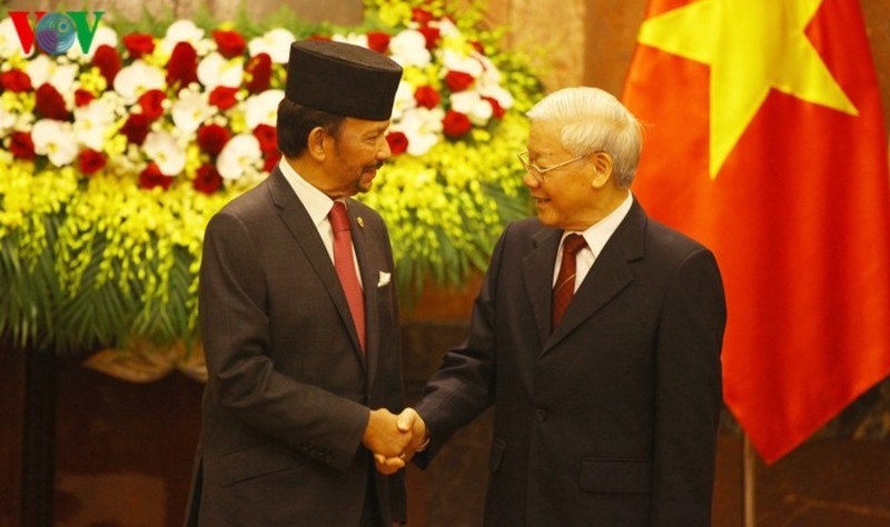 Chuyến thăm là dấu mốc quan trọng mới trong quan hệ hữu nghị truyền thống và hợp tác gắn bó giữa hai nước. Hai bên kỳ vọng đưa quan hệ song phương lên một tầm cao mới và đã ra Tuyên bố chung về thiết lập quan hệ Đối tác toàn diện Việt Nam-Brunei Darussalam. Ảnh: Tổng Bí thư, Chủ tịch nước Nguyễn Phú Trọng tiếp Quốc vương Brunei