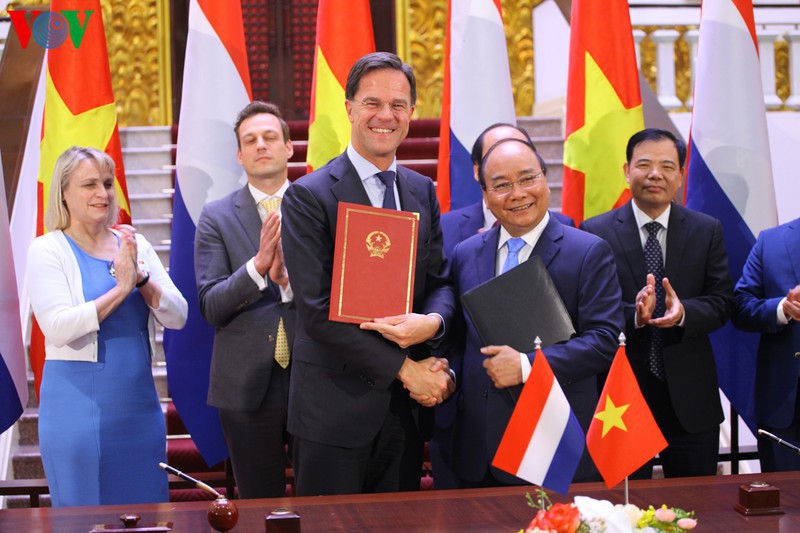 Chuyến thăm Việt Nam của Thủ tướng Mark Rutte tuy chỉ kéo dài trong vỏn vẹn 12 tiếng nhưng có lịch trình dày đặc. Trong cuộc hội đàm, hai Thủ tướng đánh giá quan hệ hai nước còn rất nhiều tiềm năng để phát triển sâu rộng hơn nữa và khẳng định hai bên nhất trí nâng cấp quan hệ Việt Nam - Hà Lan lên Đối tác toàn diện. Ảnh: Thủ tướng Nguyễn Xuân Phúc và Thủ tướng Hà Lan Mark Rutte trao đổi Bản ghi nhớ giữa 2 nước.
