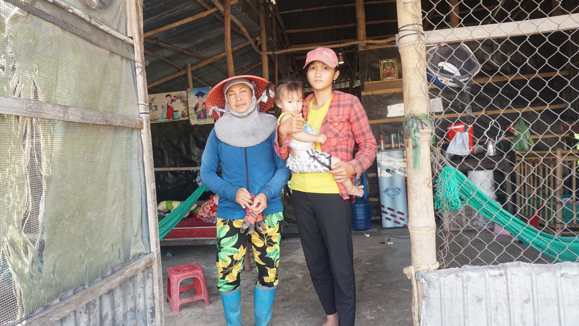 Kim Hoa và mẹ, em gái tại căn chòi tạm của gia đình.