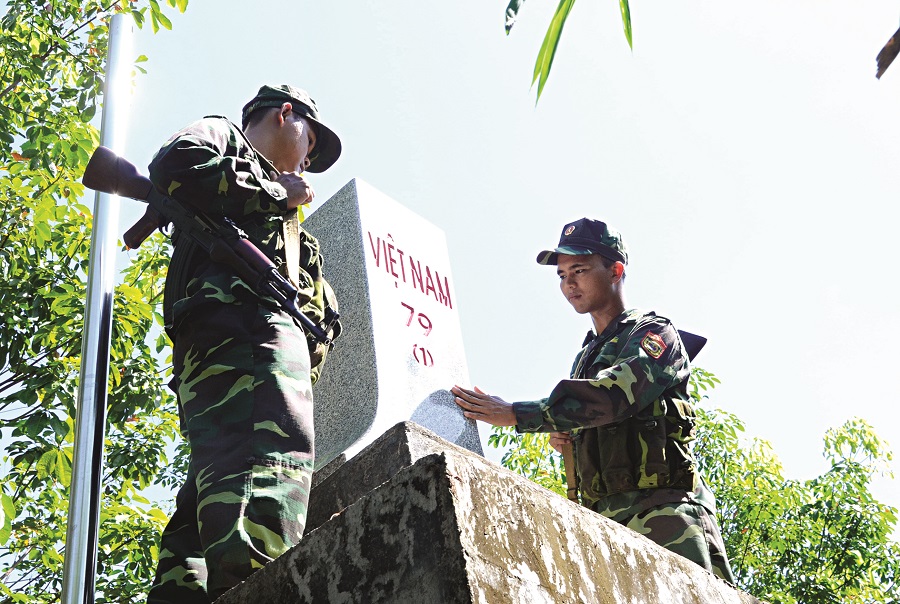 Cán bộ, chiến sĩ Đồn Biên phòng Tân Hà trên đường tuần tra bảo vệ hệ thống đường biên cột mốc. Tại vị trí cột mốc 100 này, trước đây khi chưa phân giới cắm mốc, nhân dân hai nước thường xuyên vi phạm quy chế khu vực biên giới, đến nay, tình trạng trên đã hoàn toàn chấm dứt.