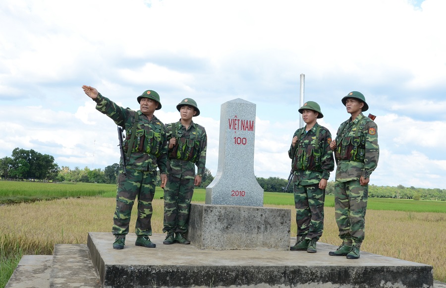 Các chiến sĩ Đồn Biên phòng Tống Lê Chân kiểm tra cột mốc 79 (1), vị trí này là điểm khởi đầu vào địa phận tỉnh Tây Ninh