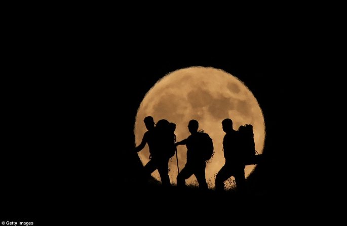 Khoảnh khắc tuyệt đẹp chụp lại khi 3 khách bộ hành cuốc bộ trên Núi Artos ở Thổ Nhĩ Kỳ vào thời điểm trăng máu xuất hiện. (Ảnh: Getty Images)