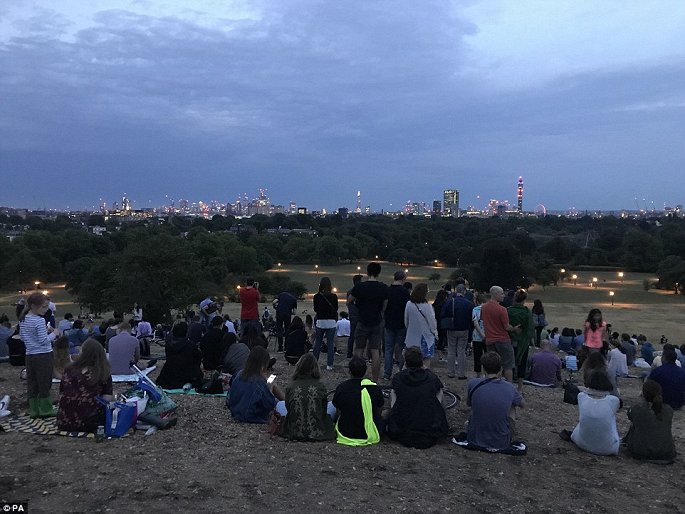 Tuy nhiên do điều kiện thời tiết nhiều nơi không thể chiêm ngưỡng hiện tượng kỳ thú này. Trên ảnh là một nhóm người ở London, Anh thất vọng vì không thể quan sát Trăng máu vì mây mù dù đã tập trung từ sớm. (Ảnh: PA)