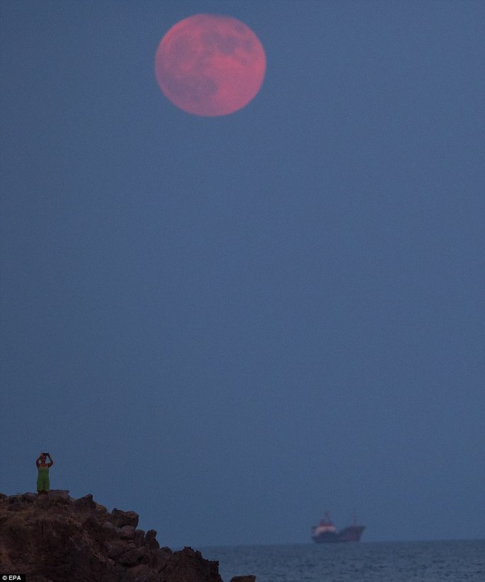 Một phụ nữ ghi lại cảnh trăng máu xuất hiện ở làng Sivrice, Canakkale, Thổ Nhĩ Kỳ. (Ảnh: EPA)