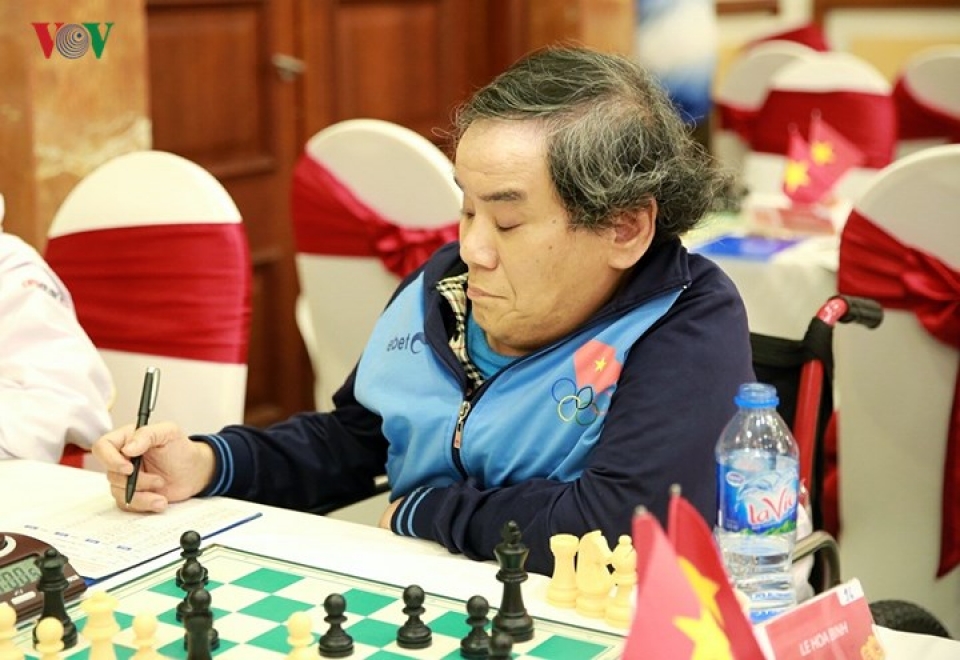 Kỳ thủ Lê Hòa Bình, 60 tuổi, bại liệt 3 chi, chỉ còn mỗi cánh tay phải hoạt động được nhưng lại là gương mặt quen thuộc trong hệ thống thi đấu cờ vua của người khuyết tật.