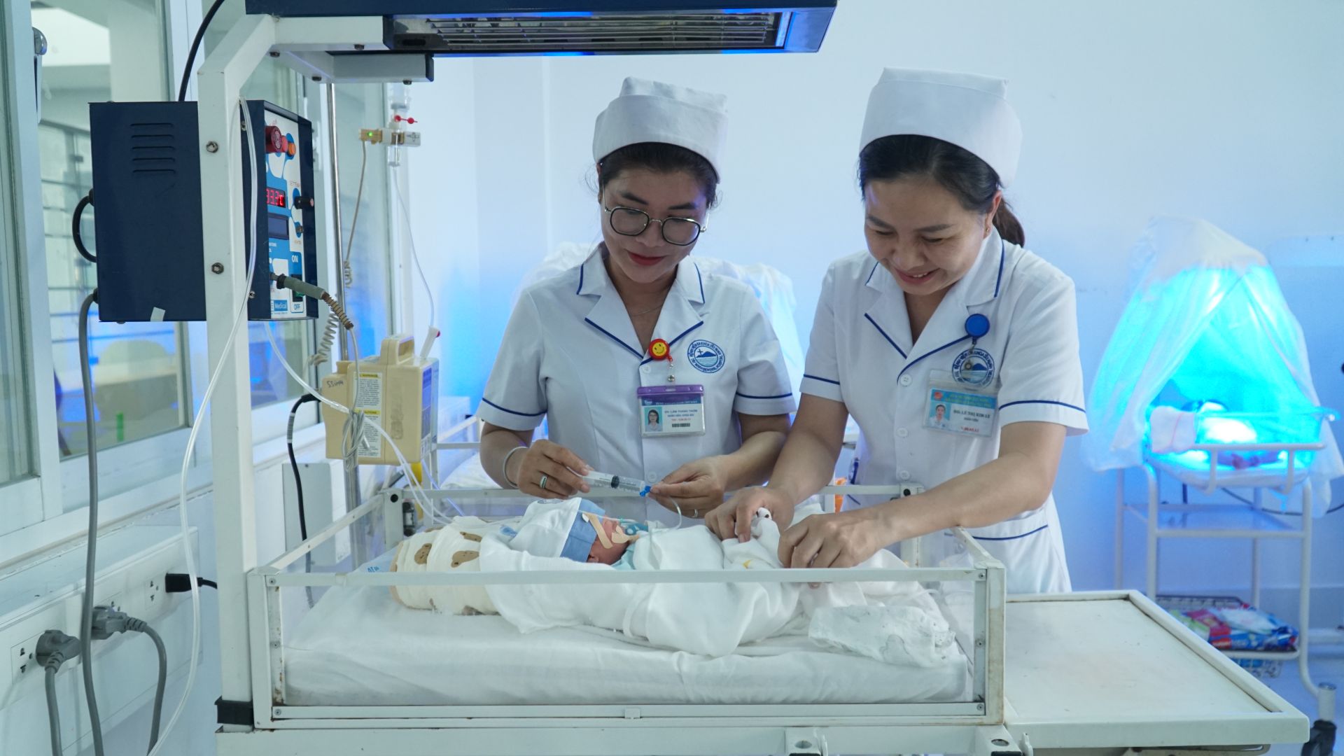 Điều dưỡng Lâm Thanh Thơm (bên trái) chăm sóc trẻ sơ sinh thở máy tại Phòng Đơn nguyên sơ sinh Khoa Nhi.