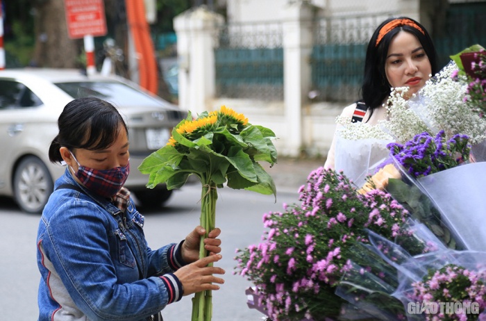 Chúng tôi gặp chị Nguyễn Thị Lựu, quê ở Bắc Giang vào buổi trưa ngày 20/10 trên vỉa hè đường Mai Văn Thưởng (quận Ba Đình, Hà Nội) khi mới chỉ bán được một vài bó hoa.