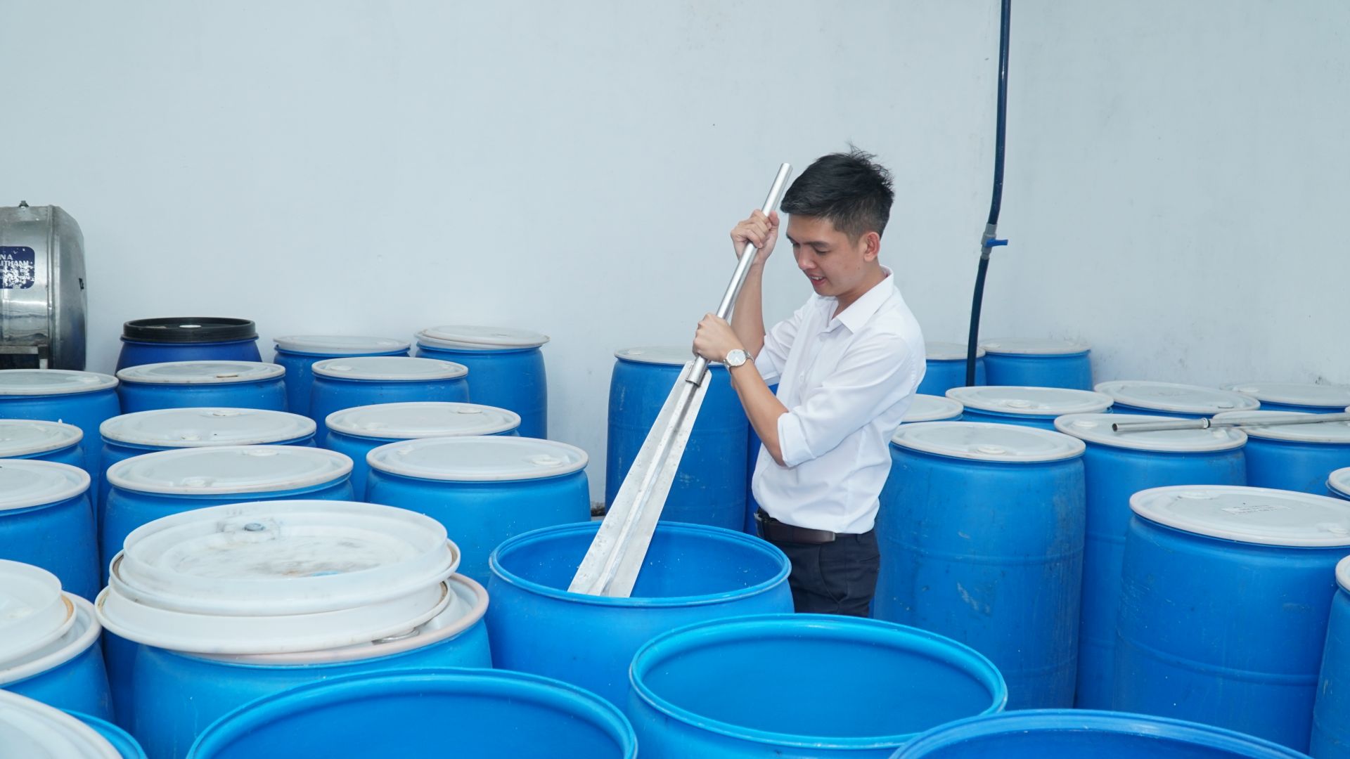 Anh Hữu Ý kiểm tra các thùng ủ rượu.