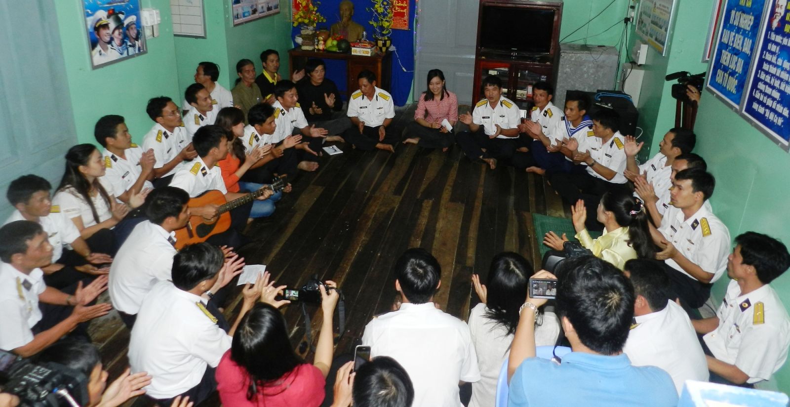 Chiến sĩ Nhà giàn DK1/10 vui văn nghệ cùng khách đến từ đất liền.