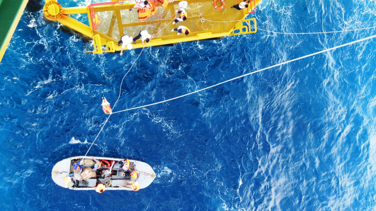 Lên Nhà giàn bằng phương pháp kéo dây.
