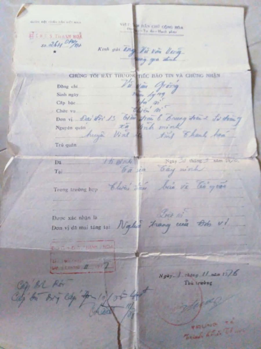 Thanh âm của hoà bình có tiếng lòng đầy nỗi trở trăn của đứa cháu mong ngóng tin tức người bác ruột đã nằm lại nơi chiến trường xưa, vẫn chưa thể trở về quê cũ. Những dòng tin em gửi cho tôi: “Bác cháu Vũ Văn Giống, sinh năm 1949; quê quán: Xã Vĩnh Minh, huyện Vĩnh Lộc, tỉnh Thanh Hoá; đơn vị: Đại đội 13, Tiểu đoàn 6, Trung đoàn 2, Sư đoàn 9; cấp bậc: Hạ sĩ; chức vụ: Chiến sĩ; hy sinh ngày 31.3.1970 tại Tà Xia thuộc địa phận tỉnh Tây Ninh; thi hài được an táng tại nghĩa trang của đơn vị”. Đọc mà tự hào, mà rưng rưng cảm xúc, nghẹn lời thương!