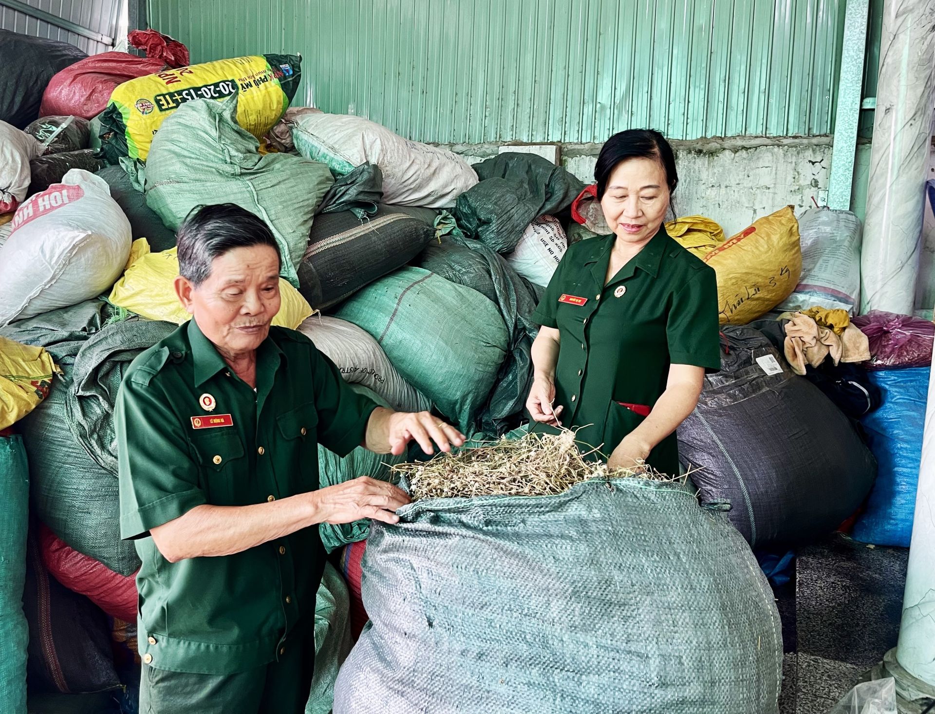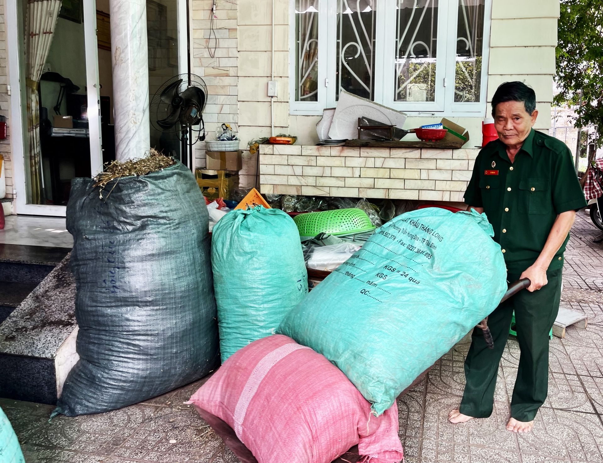 Ông Lê Mộng Hà thu gom thuốc nam sau khi phơi.