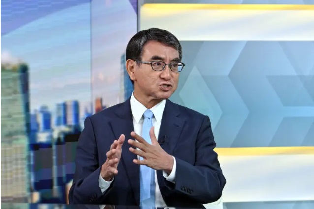 Bộ trưởng Chuyển đổi Kỹ thuật số Nhật Bản Taro Kono trên sóng truyền hình tháng 7/2024. Ảnh: Bloomberg