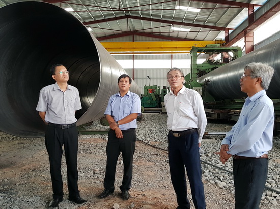 Đoàn khảo sát tham quan nhà máy sản xuất ống thép dẫn nước vượt sông Vàm Cỏ Đông.