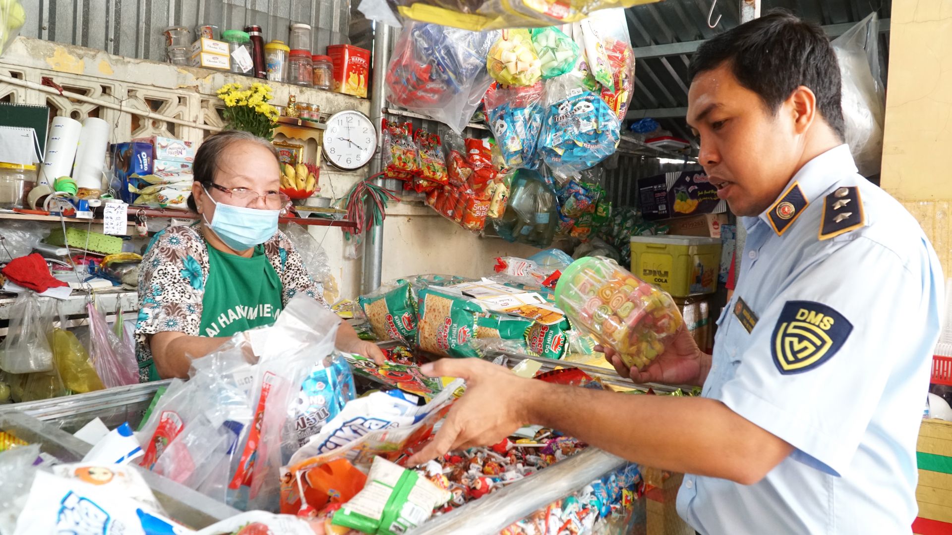 Lực lượng chức năng kiểm tra hàng hoá bày bán tại căn-tin của một trường học.