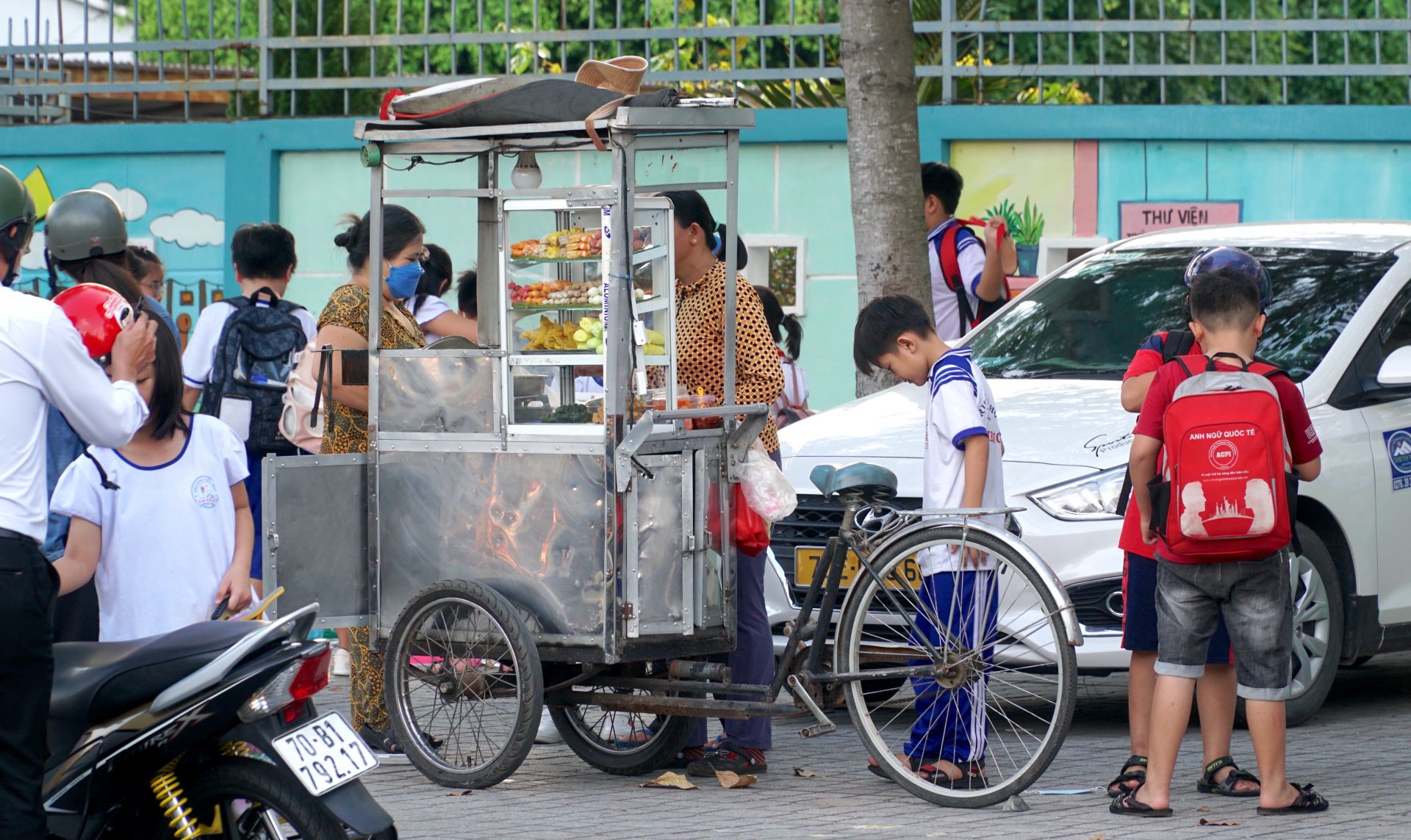 Thức ăn nhanh bày bán cho học sinh tại cổng trường học.