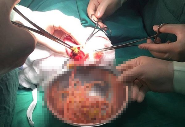 Các bác sĩ đã mở hồi tràng lấy ra một số lượng lớn giun đũa đang sống (bỏ đầy bình dung tích khoảng 1,5 lít). Sau mổ, trẻ đang được theo dõi hồi sức do tình trạng nhiễm khuẩn nhiễm độc còn nặng nề.