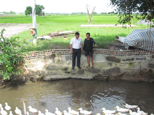 Ông Phạm Văn Bun (bên phải) và Chủ tịch Hội Nông dân xã Phước Thạnh bên bờ kè phía trước miệng cống bên phần ruộng của ông.