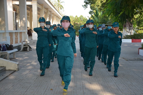 Các nữ chiến sĩ sao vuông huyện Châu Thành tham gia huấn luyện điều lệnh đội ngũ.