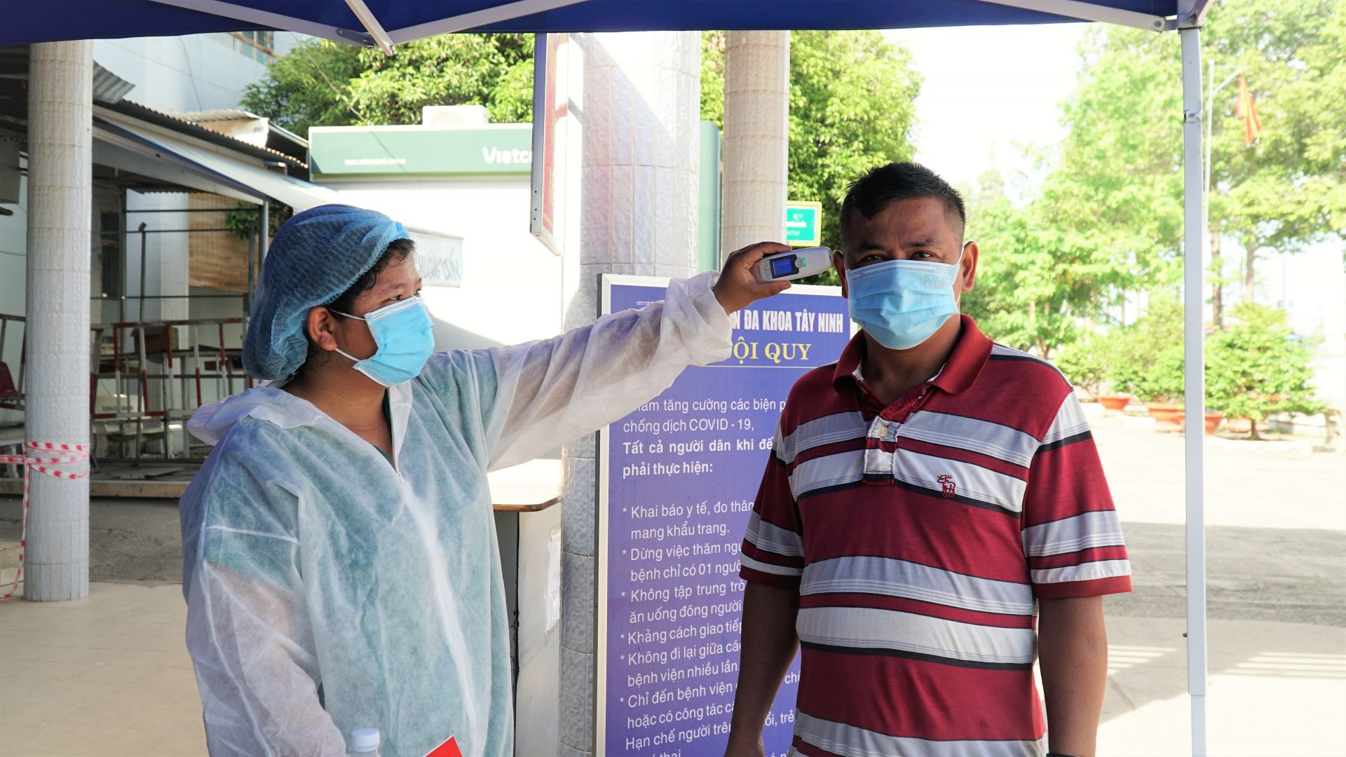 Nhân viên trực khám sàng lọc Covid-19 tại cổng cấp cứu BVĐK Tây Ninh.