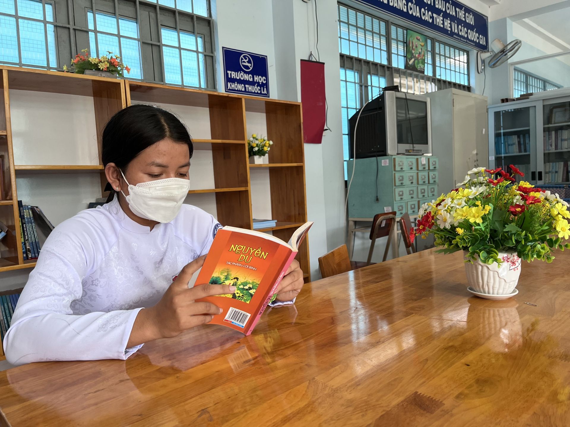 Nguyễn Thị Gia thường xuyên đến thư viện mượn sách đọc để củng cố kiến thức.